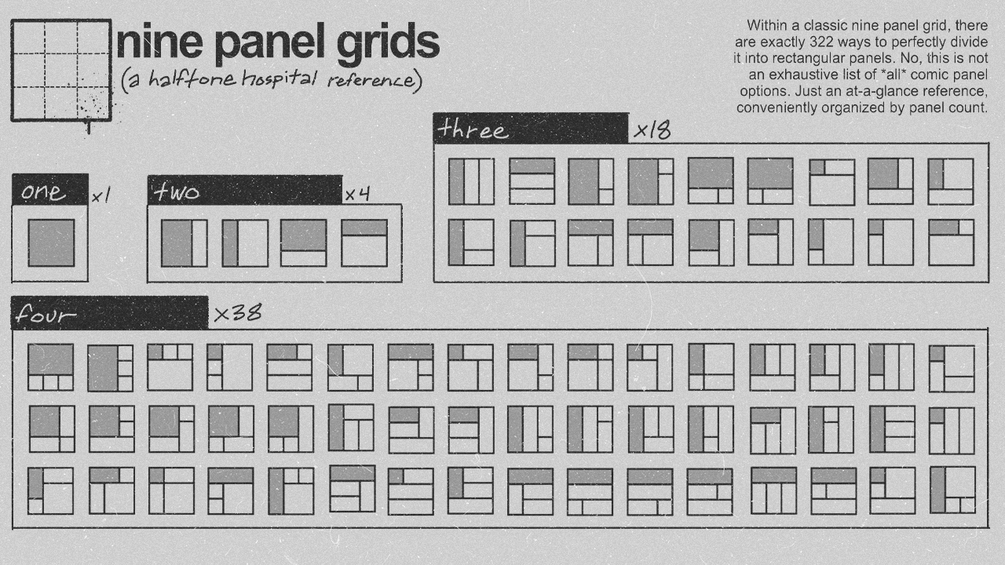 This printable reference is a comprehensive list of all possible formal divisions of a nine panel grid. Of course, there are infinitely more ways to divide panels once you get off the nine panel grid, but I've found it to be a great starting point.